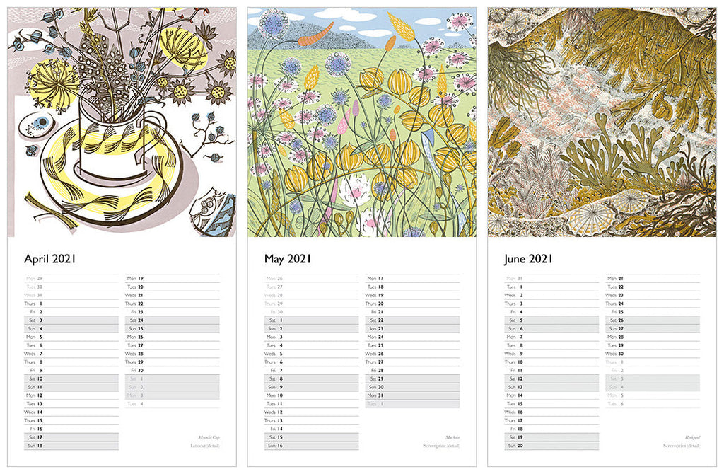 For 2021 we've produced a wire bound hanging calendar that features a selection of Angie Lewin's screenprints, linocuts, wood engravings and lithographs.